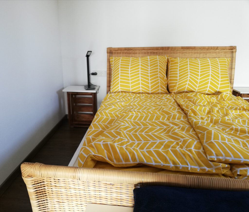 Der Wohn-/Schlafbereich bietet ein 140x200cm Bett sowie eine Schlafcouch, auf der ebenfalls bis zu zwei Personen übernachten können. Wohnbereich und Schlafbereich können zudem durch einen Vorhang voneinander abgetrennt werden.